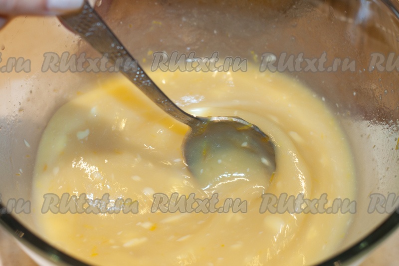 Добавить растопленное масло, слегка взбитое яйцо, цедру и еще раз размешать. Постепенно добавлять мучную смесь к жидкости, чтобы получилось однородное тесто без комков.