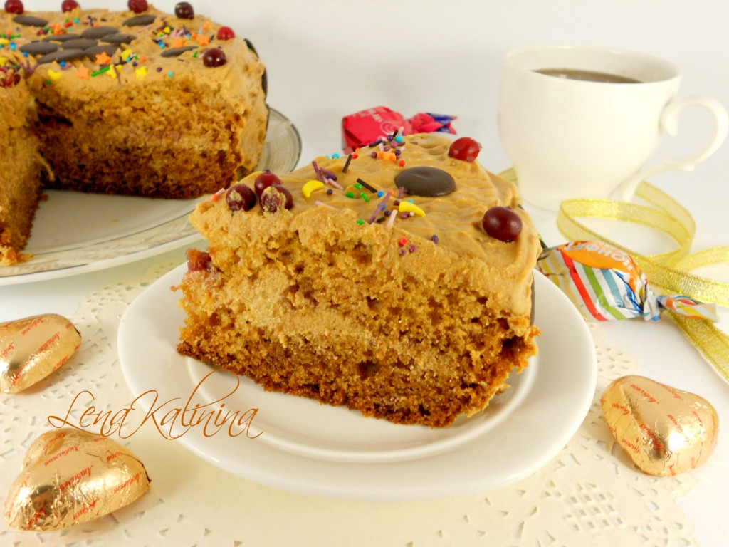 Для приготовления крема для медовика нужно сливочное масло комнатной температуры взбить миксером с варёной сгущёнкой до однородности (в течение 2-3 минут). Смазать каждый корж медовика кремом, сложить коржи друг на друга, бока тоже смазать кремом. Украсить торт ягодами, цветной присыпкой и шоколадными каплями или на ваше усмотрение.