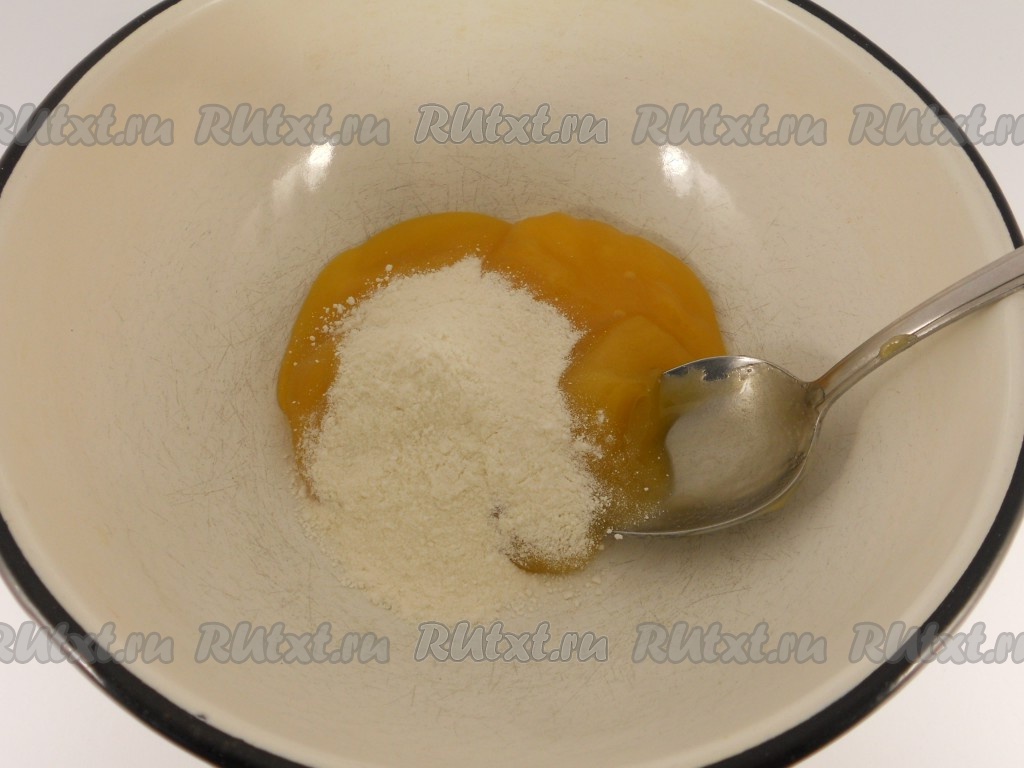 Добавить в яичную смесь подготовленную медовую смесь. Тщательно перемешать. Всыпать просеянную муку в несколько приёмов, каждый раз аккуратно вмешивая её в тесто. Тесто должно получиться, напоминающим сметану средней густоты.