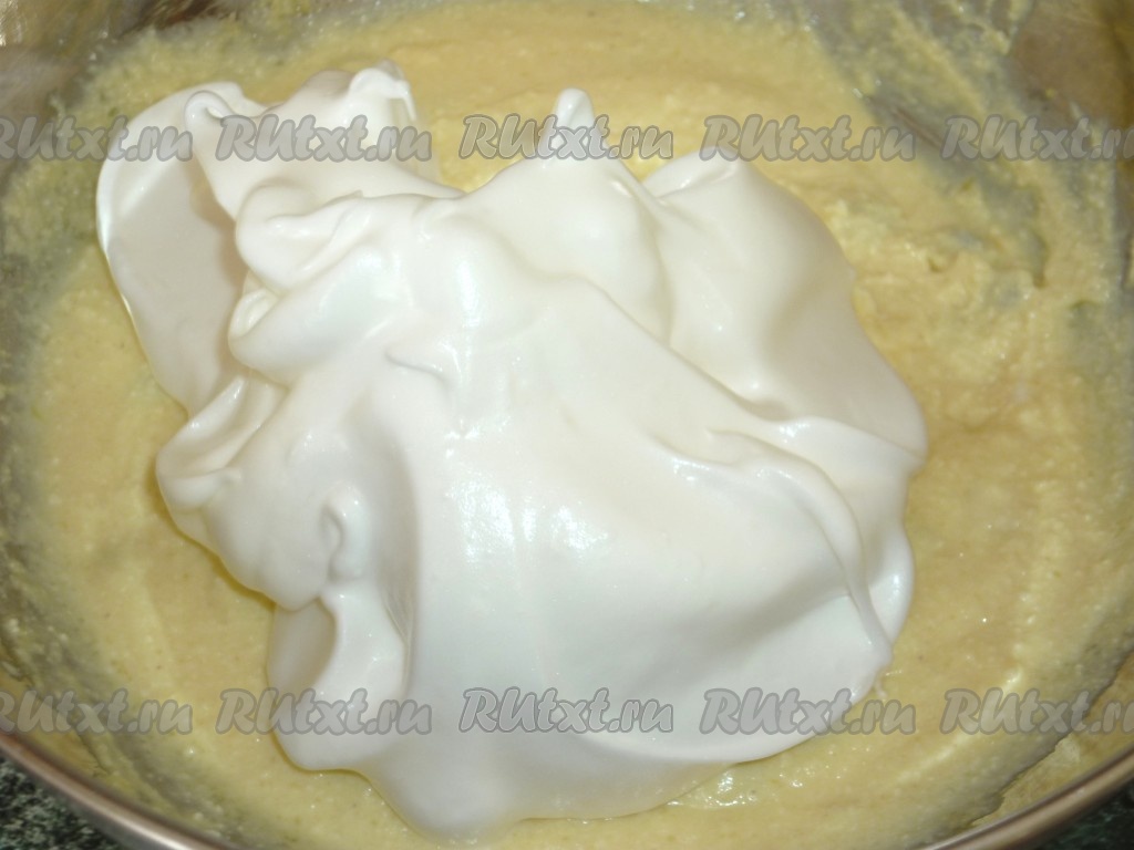 Белки взбить миксером до стойких пиков. Аккуратными движениями, сверху вниз, вмешать взбитые белки в творожную массу.