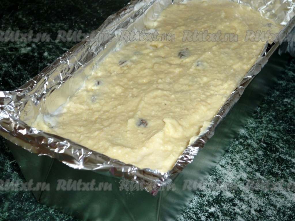 Форму для выпечки застелить фольгой и выложить творожную массу.