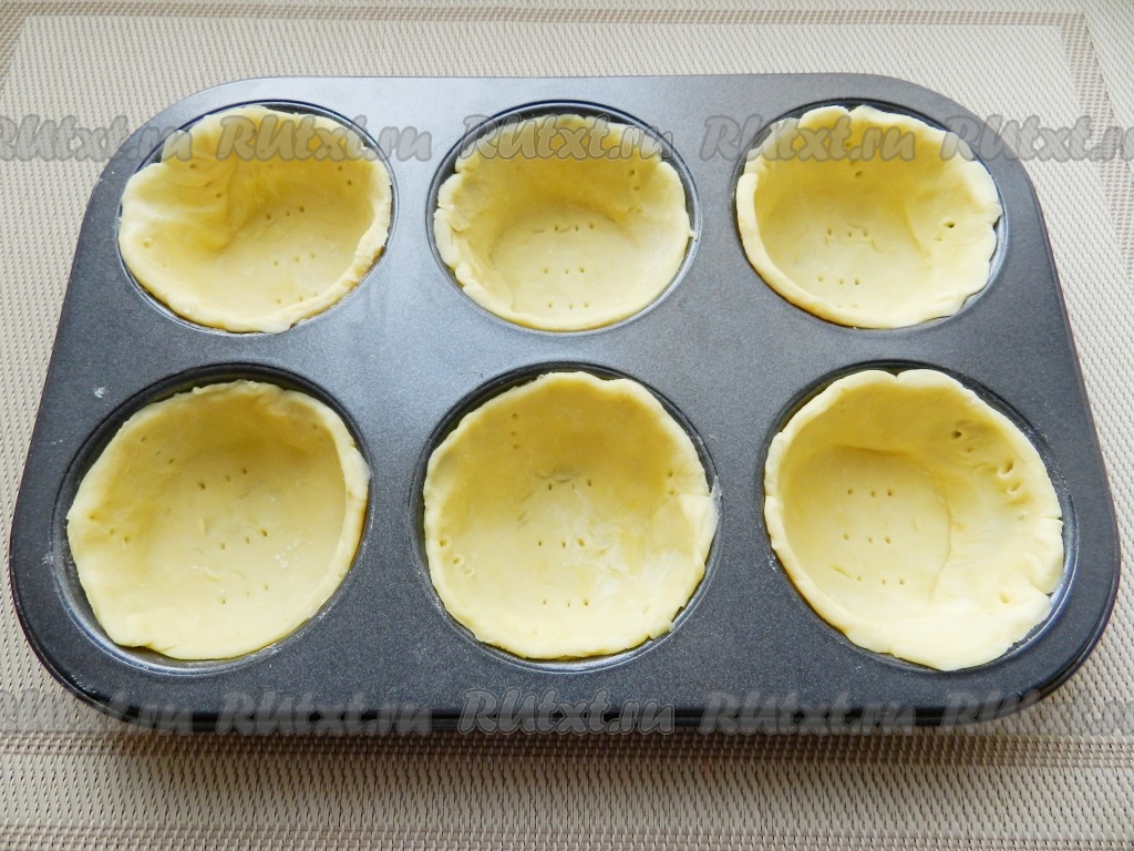 Тесто достать из холодильника, раскатать и вырезать из него 10 кругов диаметром больше, чем форма для выпечки. Форму для выпечки смазать маслом, выложить тесто, разровнять и наколоть вилкой в нескольких местах.