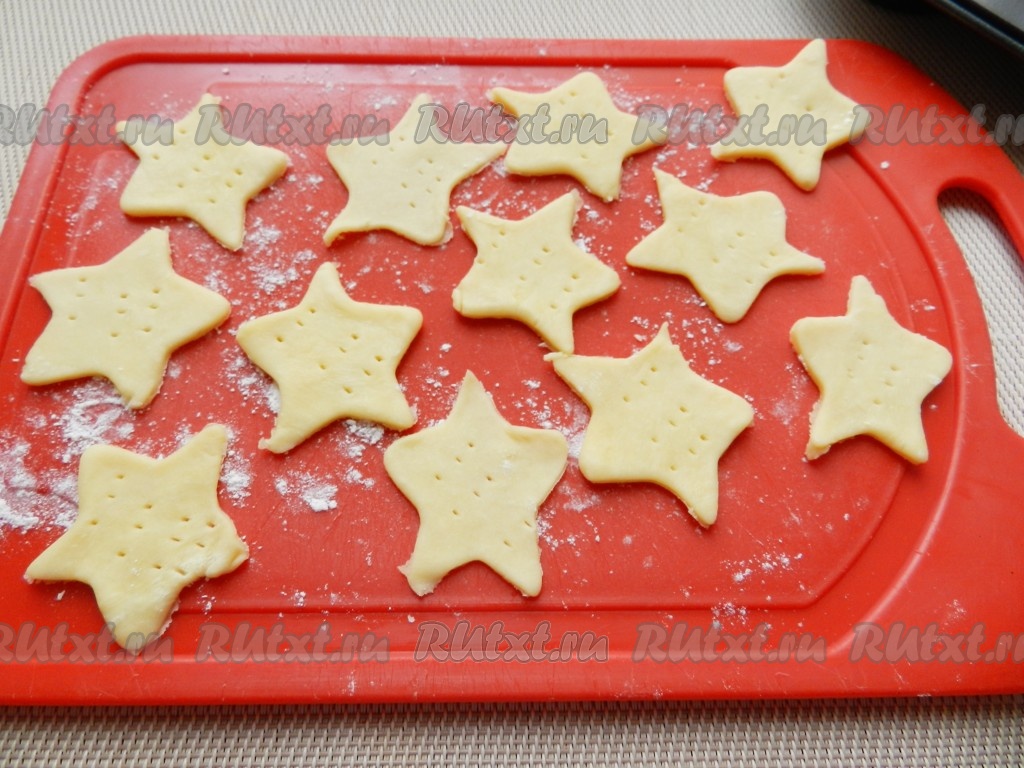 Из оставшегося теста вырезать звездочки или другие фигурки, проткнуть вилкой.