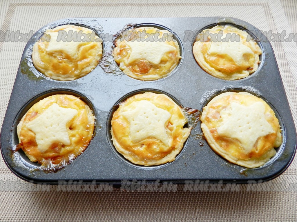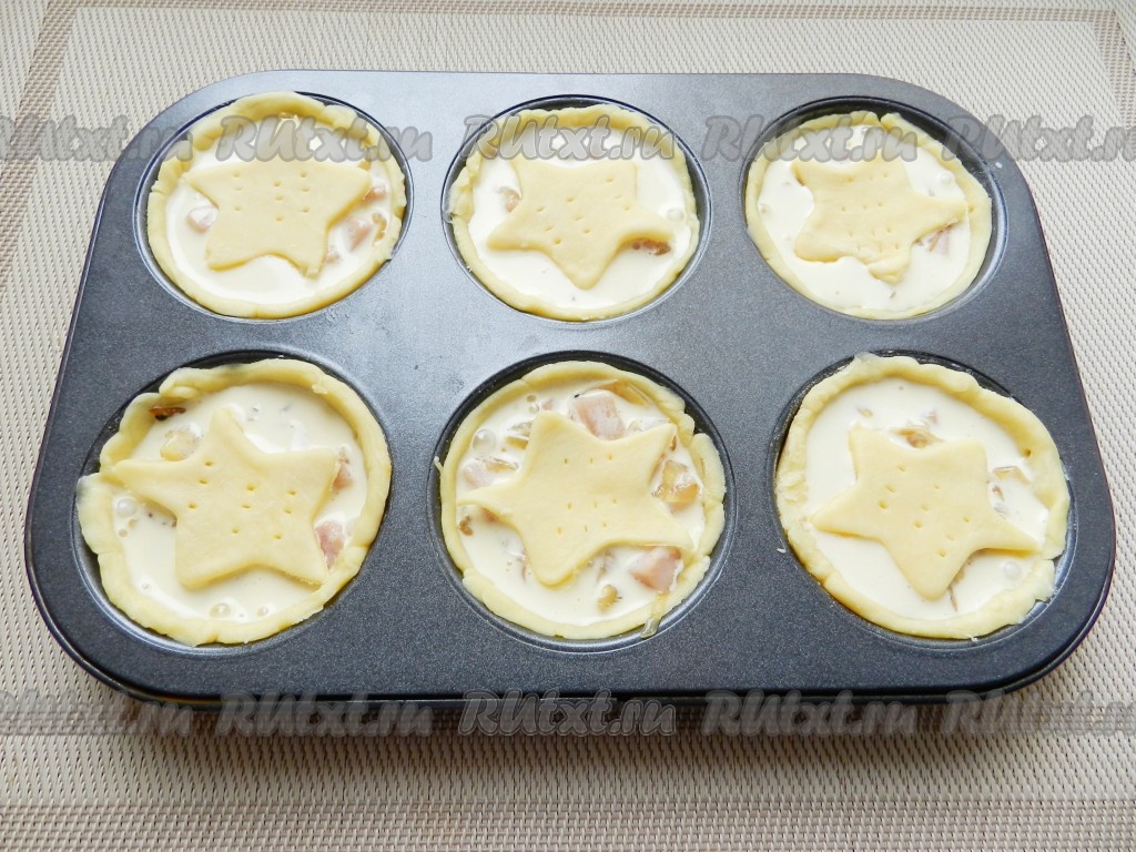 Залить заливкой, примерно по 2-3 столовые ложки на одну форму, сверху разложить звездочки из теста и поставить в разогретую до 180 градусов духовку на 25 минут.