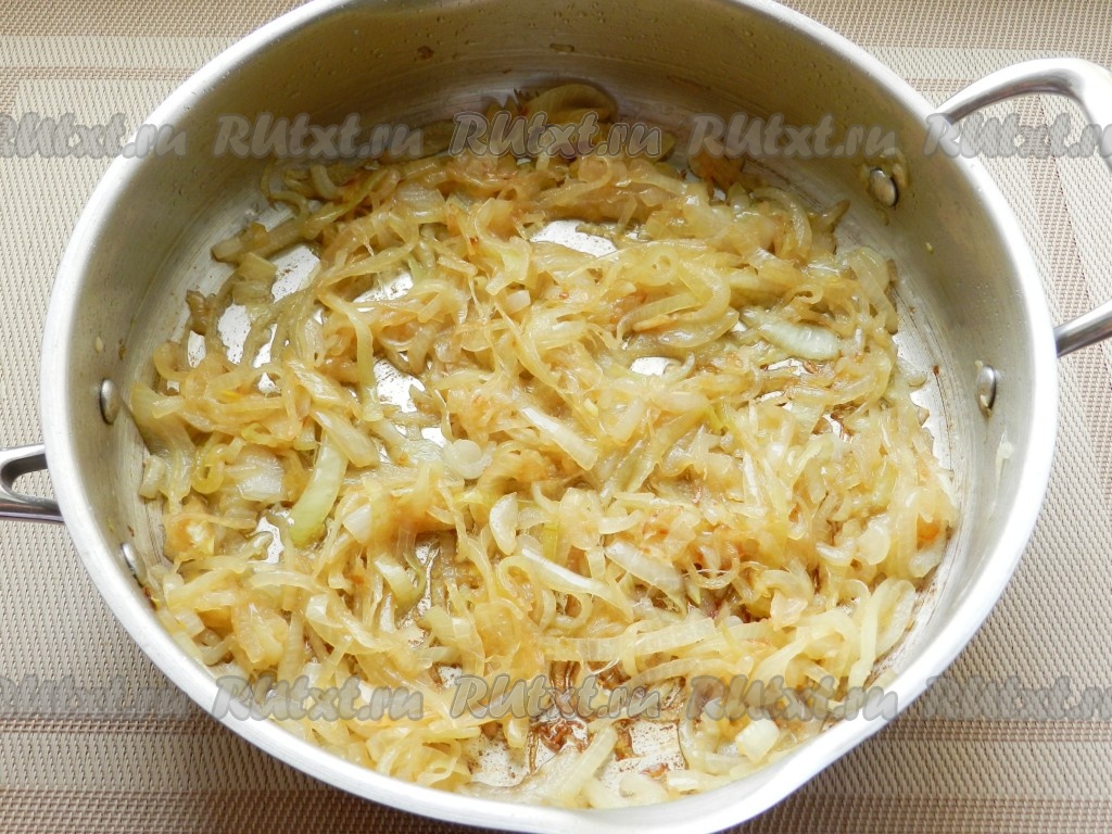 Лук нарезать полукольцами и обжарить на растительном масле до золотистого цвета, посолить и поперчить.