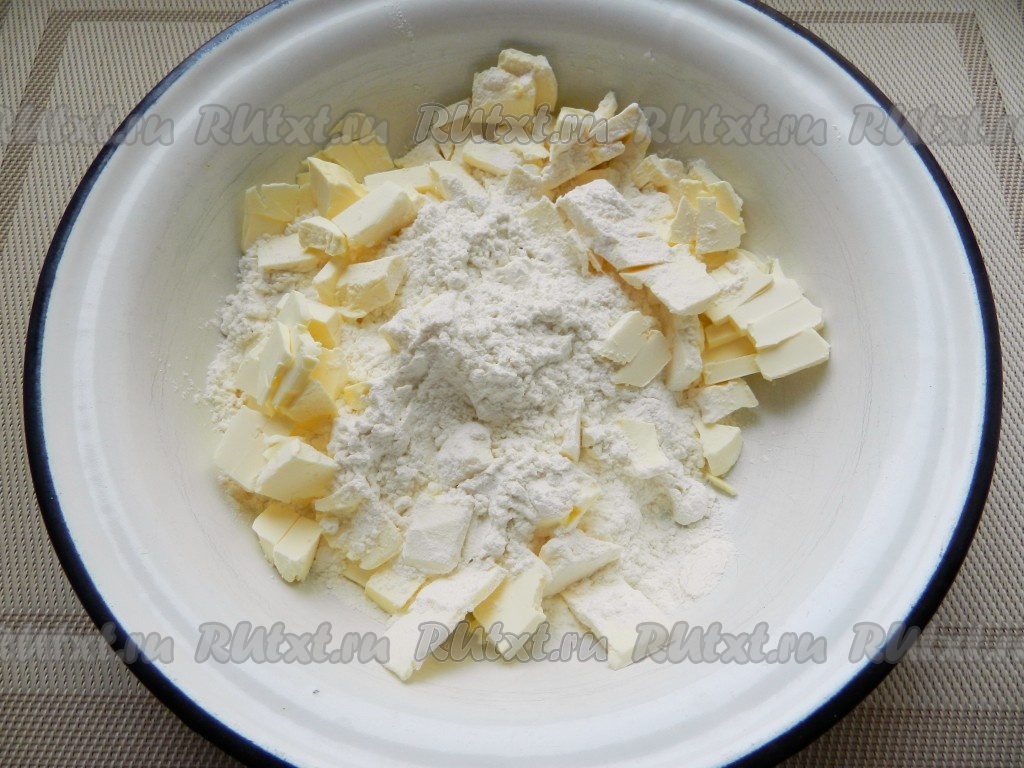 В миску всыпать муку и соль, масло нарезать кубиками и руками смешать с мукой в крошку.