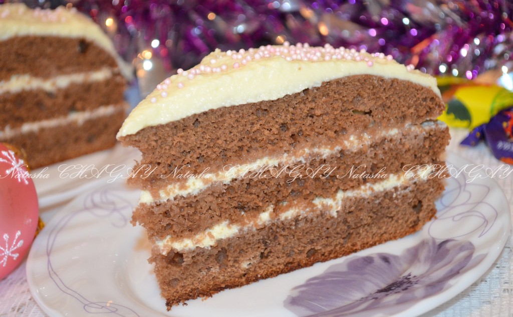 Сложить друг на друга смазанные коржи. Украсить торт по вкусу. Я украсила верх торта кондитерской посыпкой.