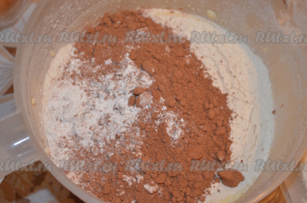 Затем добавить сметану и ещё раз взбить миксером до однородности. Всыпать муку, крахмал (крахмал делает тесто более пористым), какао и разрыхлитель, перемешать миксером тесто до однородного состояния.