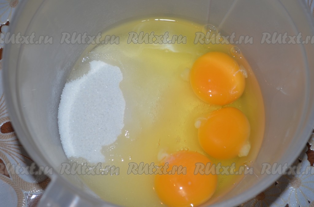 Вначале замесим тесто, для этого в чашу, удобную для взбивания, нужно насыпать сахар и разбить яйца.