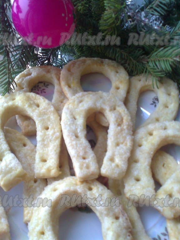 Сгибаем в виде подковы. Выпекаем печенье в разогретой до 180 градусов духовке 15-20 минут. Готовим белковую глазурь. Для этого белок взбиваем до мягкой пены, добавляем просеянную сахарную пудру и недолго взбиваем до однородного состояния.