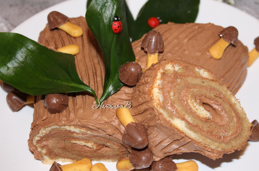 Украсить по желанию: у меня детское печенье - "грибочки", декоративные листочки с божьими коровками. Готовый торт-рулет "Рождественское полено" хорошенько охладить, при подаче произвольно нарезать на порционные кусочки.