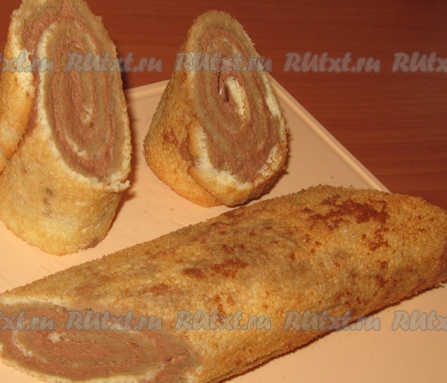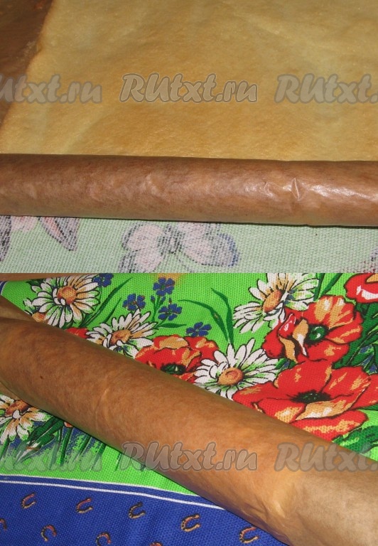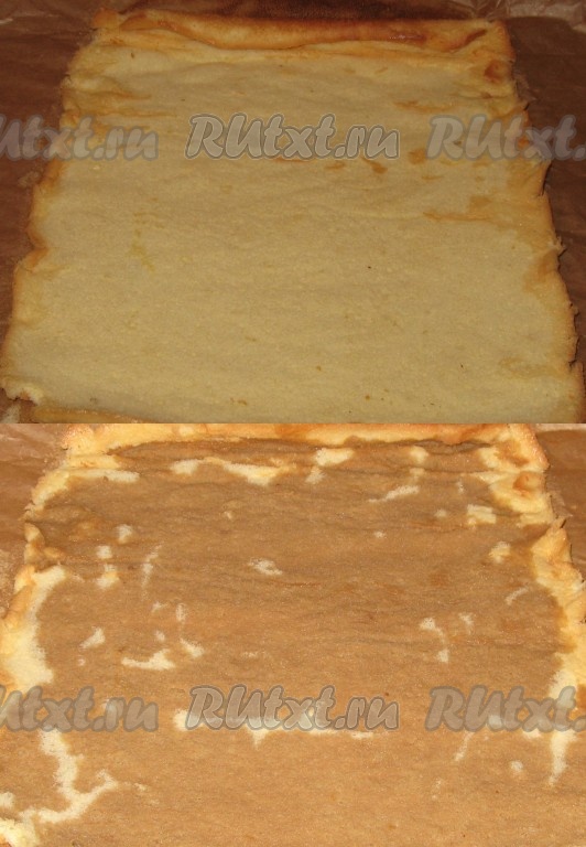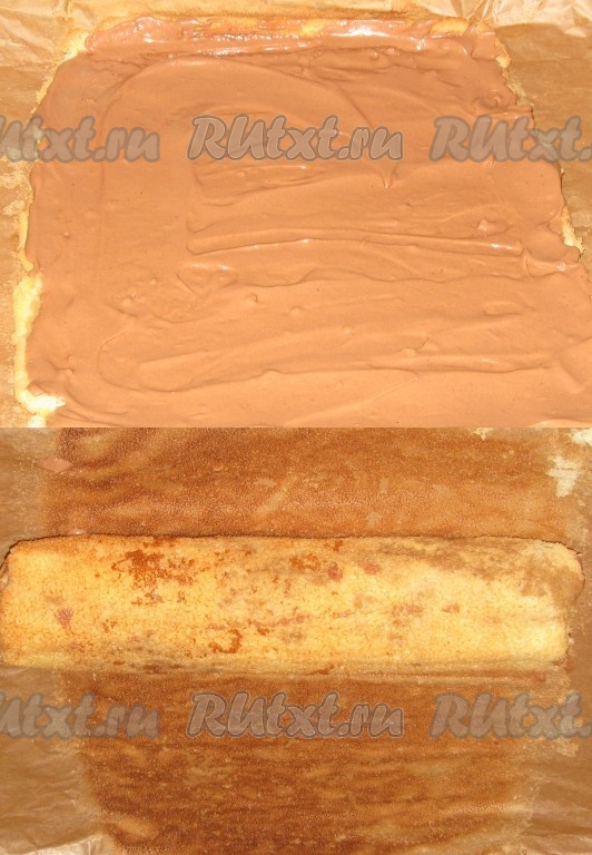 Готовый бисквит достать и горячим свернуть в рулет прямо с пергаментом, завернуть в полотенце и охладить.
