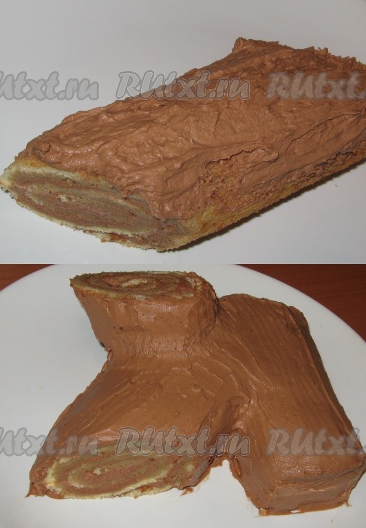 Самый большой кусок рулета выложить на блюдо и хорошенько обмазать кремом, затем сверху и сбоку приставить срезы рулета и тоже аккуратно обмазать кремом, скрывая "швы".
