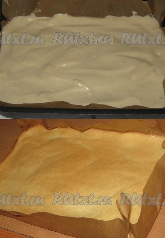 Тесто равномерно выложить на противень, застеленный пергаментом, поставить в духовку на 10-12 минут до легкого золотистого цвета.