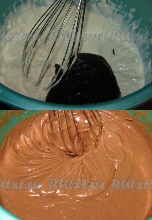 Сливки слегка взбить миксером, затем добавить растопленный шоколад, все взбить до однородной консистенции и цвета, крем убрать в холодильник.