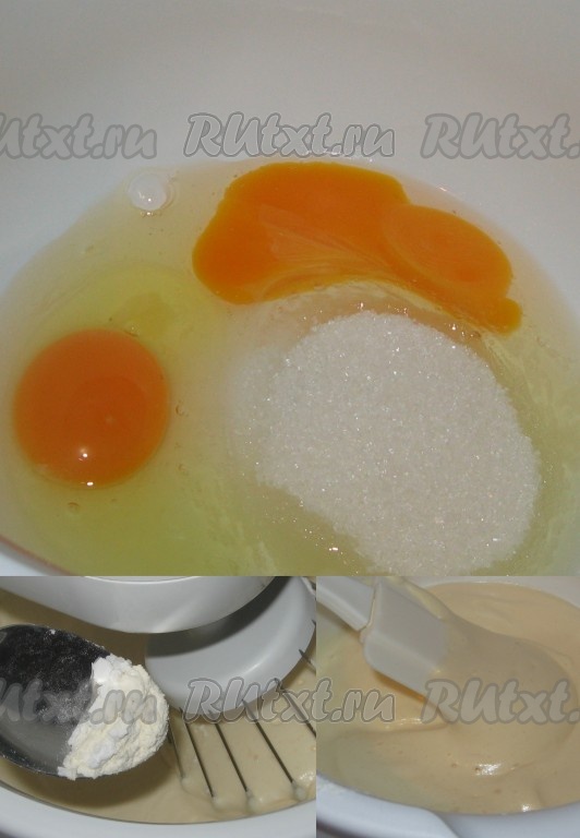 Духовку разогреть до 200 градусов. Яйца и сахар взбить до пышной кремовой массы (10-15 минут), затем, не переставая взбивать, но уже на минимальной скорости миксера, постепенно всыпать просеянную муку и крахмал.