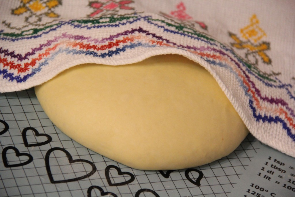 Прикрыть сдобное дрожжевое тесто сверху полотенцем и оставить в миске на 1 час в тёплом месте. Тесто округлится и увеличится вдвое.