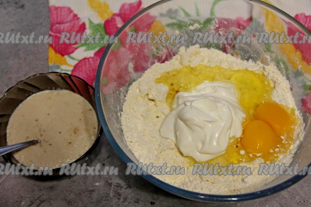 Влить опару и замесить тесто. Сначала смешивать тесто столовой ложкой, а по мере его вымешивания, продолжить уже замес руками. Готовое тесто должно немного липнуть к рукам, но при этом оно должно быть мягким, нежным, приятным в работе.
