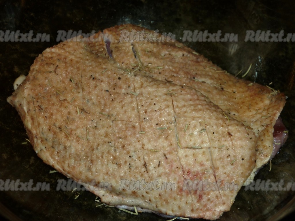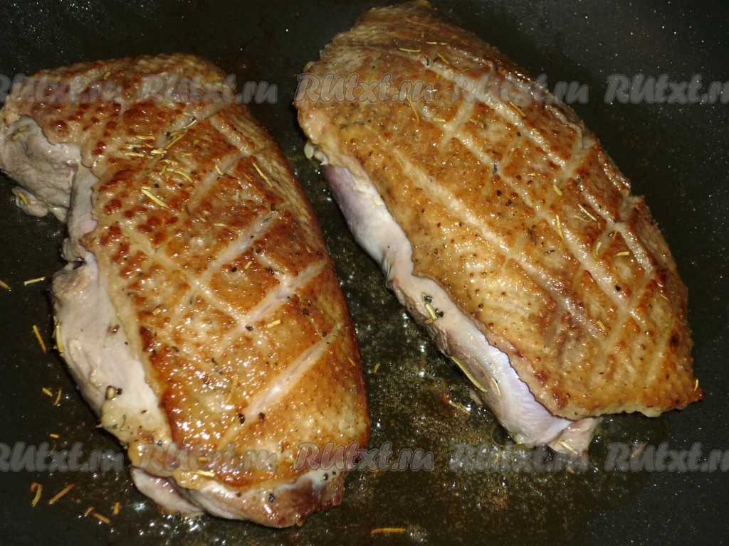 Утиные грудки вымыть, обсушить бумажным полотенцем. На кожице острым ножом сделать надрезы крест-накрест, только так, чтобы не порезать мясо. Натереть солью, перцем и розмарином.