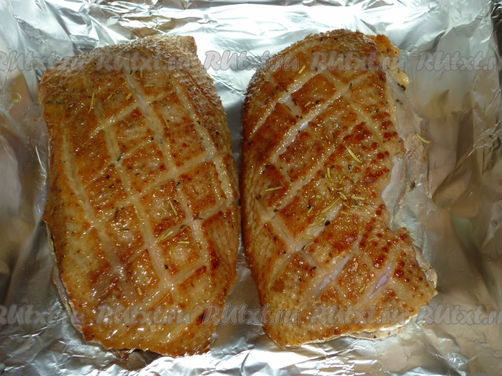 Обжаренные утиные грудки завернуть в фольгу и отправить на 20 минут в разогретую до 180 градусов духовку.