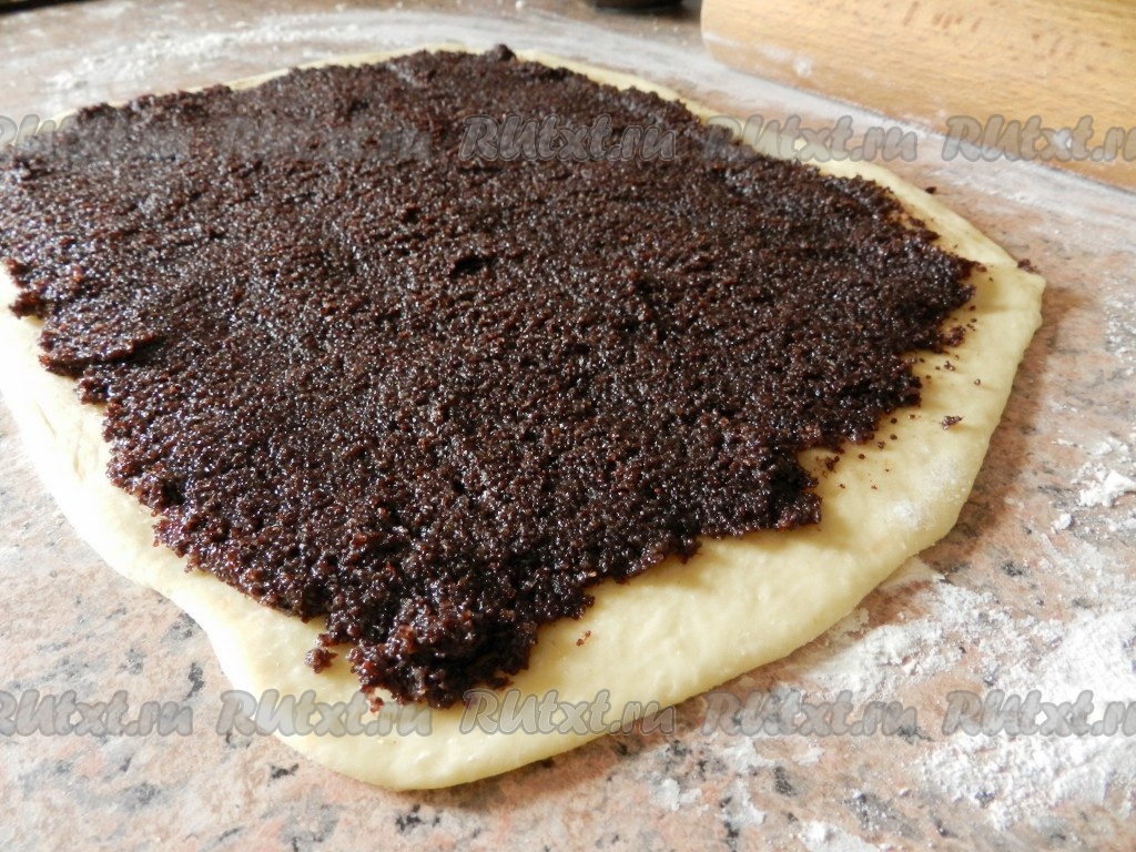 Равномерно распределить маковую начинку и свернуть пласт теста рулетом.
