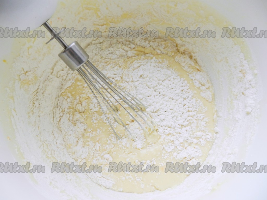 Добавить растопленное масло, ванильную эссенцию, влить теплое молоко, все тщательно перемешать. С апельсина снять цедру и добавить в смесь.