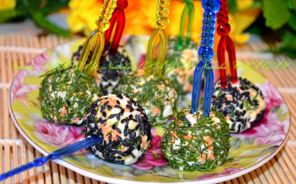 Кунжут, по желанию, слегка обжарить на сухой сковороде, дать остыть. Из сырной массы скатать маленькие шарики. Часть шариков обвалять со всех сторон в нарезанном укропе.