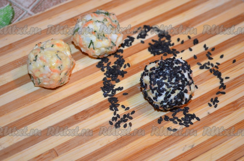 Часть сырных шариков обвалять со всех сторон в кунжуте.