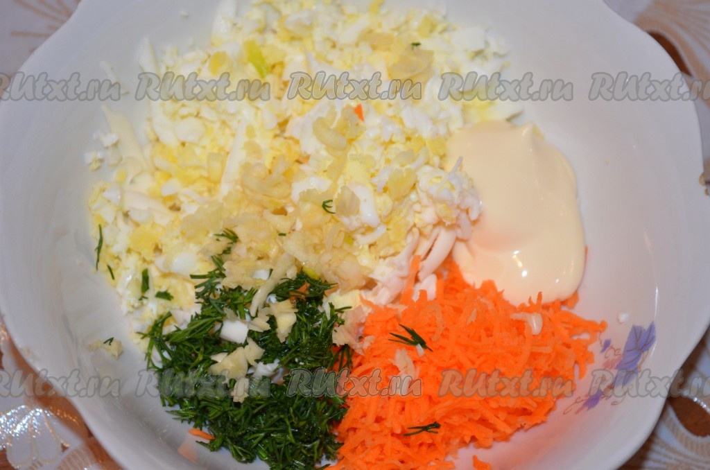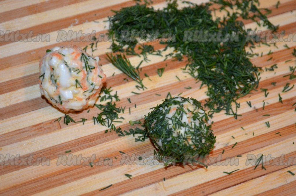 Укроп вымыть, нарезать. Морковь очистить, натереть на мелкой тёрке. В миске соединить сыр, яйца, морковку, небольшую часть нарезанного укропа, добавить пропущенный через пресс (или мелко нарезанный) чеснок и 1-1,5 столовых ложки майонеза, посолить и поперчить по вкусу. Тщательно перемешать сырную массу, она должна получиться достаточно густой, из неё должны хорошо лепиться шарики. Если нужно, добавьте ещё немного майонеза, масса не должна быть суховатой.