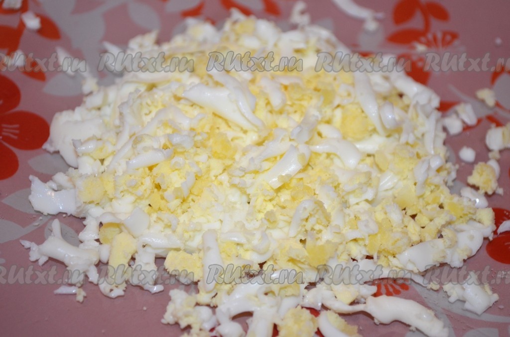 Яйца также натереть на крупной тёрке.