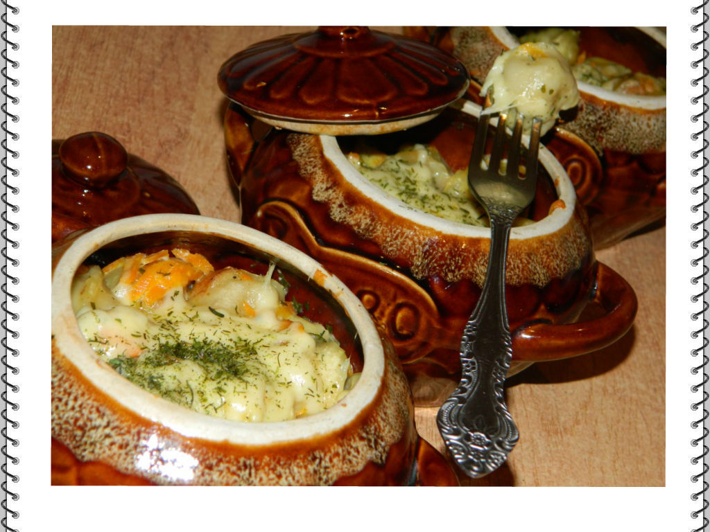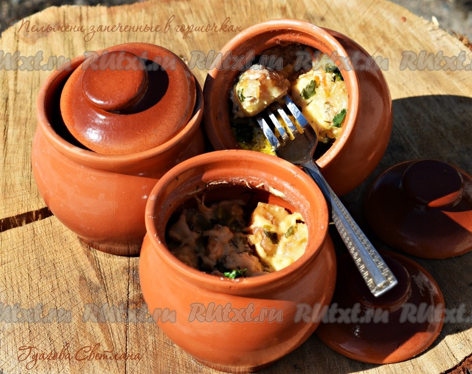 Затем снимаем крышечки, посыпаем пельмени сыром, натёртым на крупной тёрке. Открытые горшочки с пельменями ставим в духовку ещё на 10 минут, чтобы сыр как следует расплавился.
