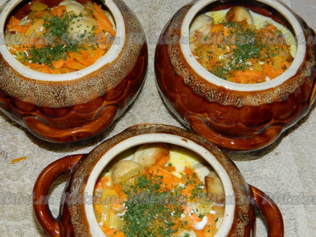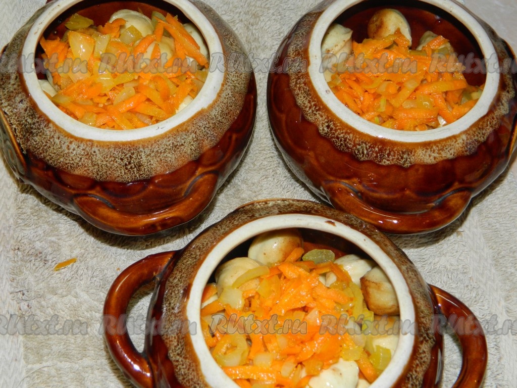 Слегка остывшие овощи равномерно раскладываем по горшочкам поверх пельменей.