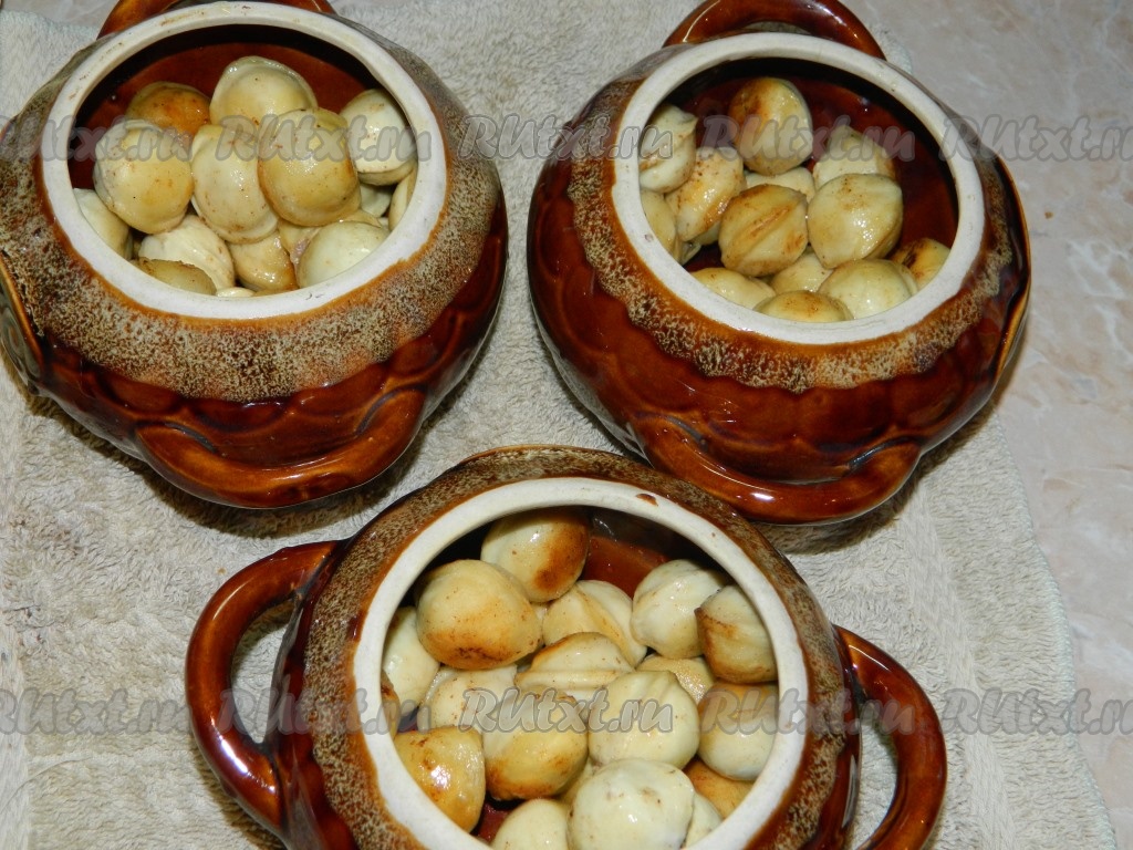 Раскладываем обжаренные пельмени по горшочкам, заполняя горшочки на 2/3 объёма, так как пельмешки ещё увеличатся в объёме в процессе запекания. Я разложила по 3 горшочкам. Даём пельменям немного остыть.