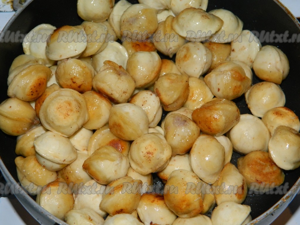 В сковороде разогреваем растительное масло, выкладываем замороженные пельмени и обжариваем их до румяного цвета со всех сторон, периодически перемешивания.