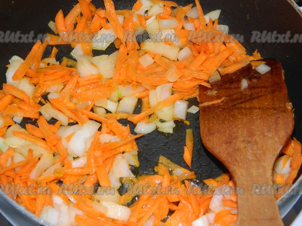 Пока пельмени остывают, обжарим овощи. Для этого морковку и лук очищаем. На растительном масле обжариваем мелко нарезанный лук и натёртую на крупной тёрке морковь на среднем огне, периодически помешивая, до мягкости овощей (ориентировочно на обжаривание потребуется минут 8). Снимаем овощи с огня, даём остыть.