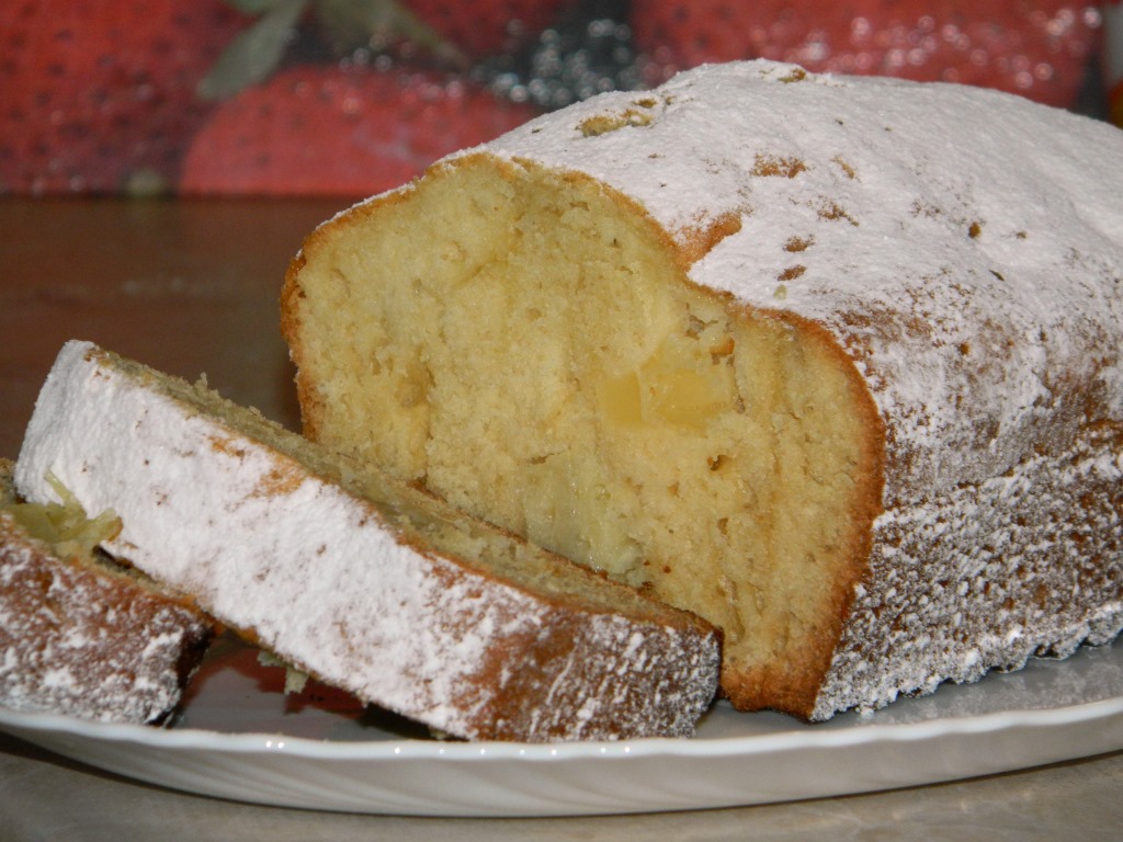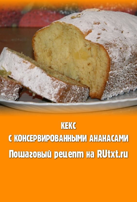 Остывшую выпечку посыпаем сахарной пудрой, режем на кусочки и подаём к чаю. Кекс получается пышным, мягким, а благодаря кусочкам консервированного ананаса ещё и очень вкусным.