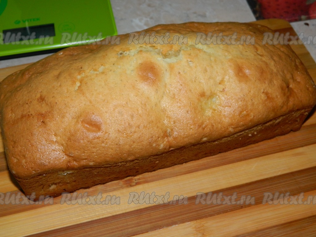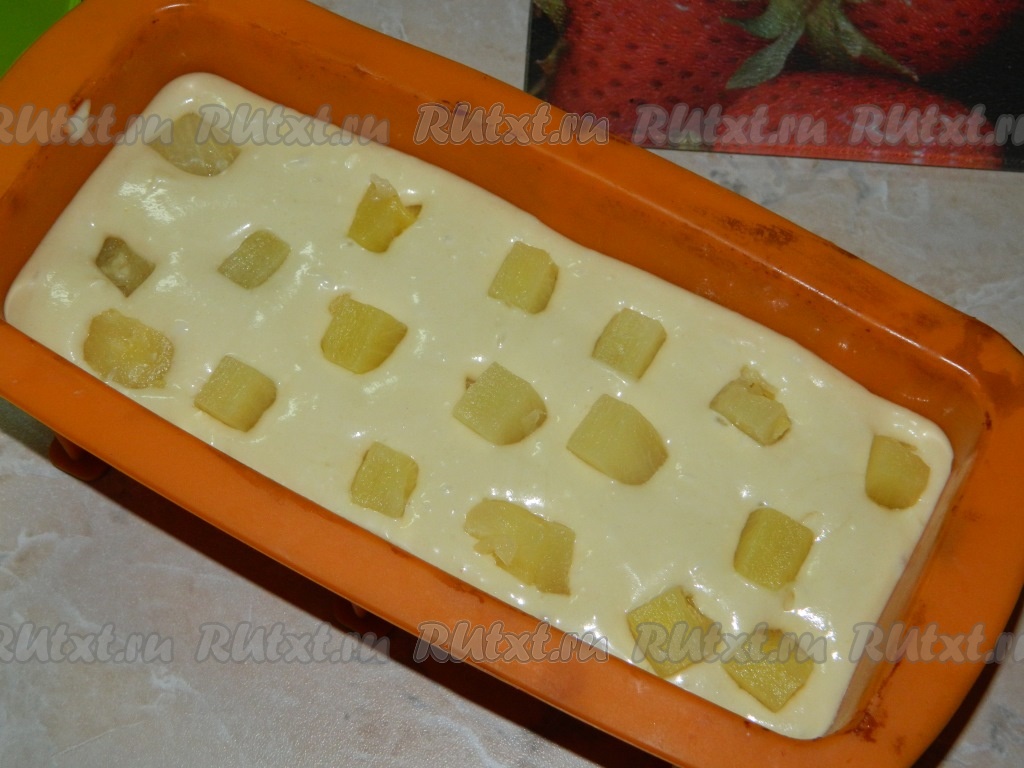 Кусочки консервированного ананаса немножко притапливаем в тесто. Ставим форму с тестом в хорошо прогретую духовку. Выпекаем кекс при температуре 180 градусов 50 минут. Готовность можно проверить, проколов кекс сухой шпажкой (если шпажка после прокола кекса останется сухой, на ней будут отсутствовать следы теста, значит выпечка готова). Достаём готовый кекс из духовки, даём немного остыть в форме.