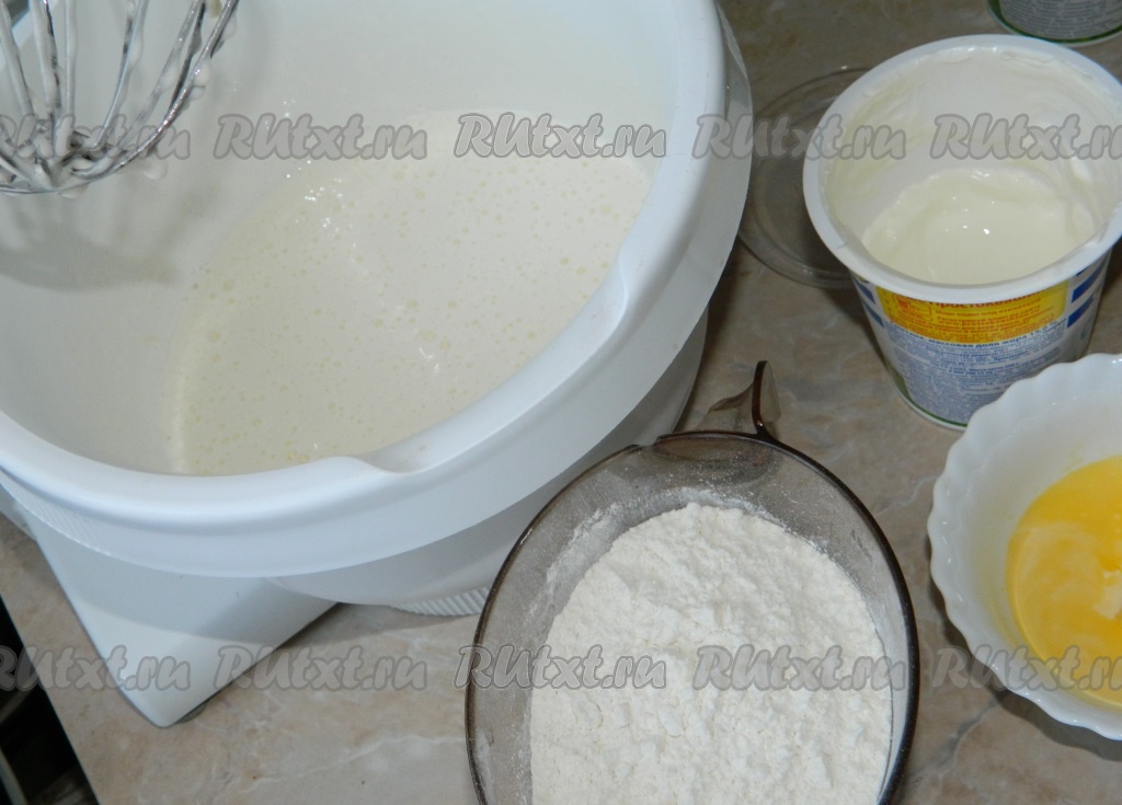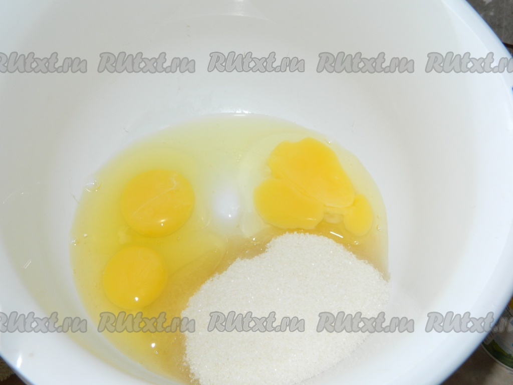 При помощи миксера взбиваем в глубокой чаше яйца с сахаром в течение 4-5 минут. Яичная смесь в процессе взбивания посветлеет и увеличится в объёме.