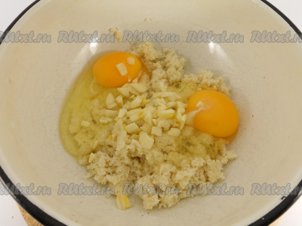 Хлеб отжать, выложить в глубокую миску, добавить яйца и мелко нарезанный чеснок.