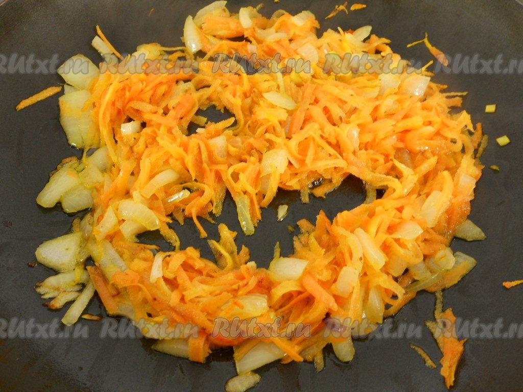 Лук нарезать мелко. Морковь натереть на крупной тёрке. В сковороду влить растительное масло, добавить сливочное масло, выложить морковку с луком и обжарить на среднем огне овощи, помешивая, до мягкости (в течение 6-7 минут).