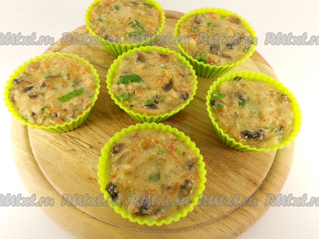 Если грибная масса покажется вам слишком жидкой, добавьте пару столовых ложек панировочных сухарей. Разложить массу по порционным формочкам, смазанным растительным маслом, или выложить в одну форму.