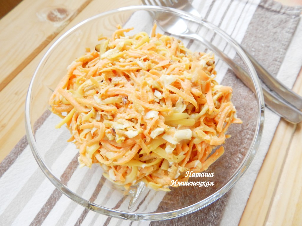 Салат с морковью и грецкими орехами можно сразу подавать к столу. Благодаря добавлению яйца и сыра это блюдо получается более нежным и сытным. Уверена, этот яркий салат порадует вас своим пикантный вкусом!