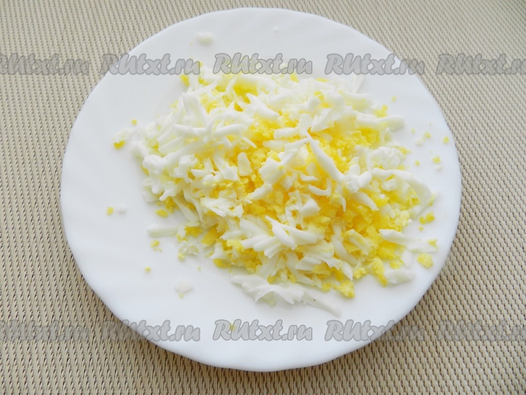 Варёное яйцо тоже натереть на крупной тёрке.