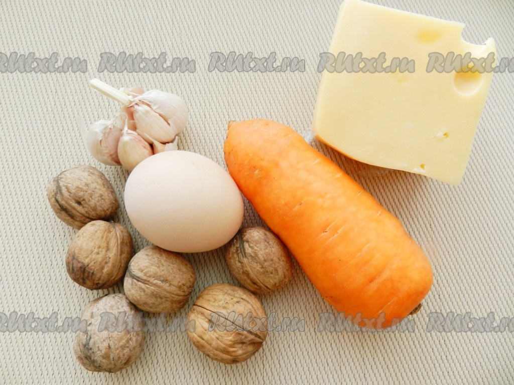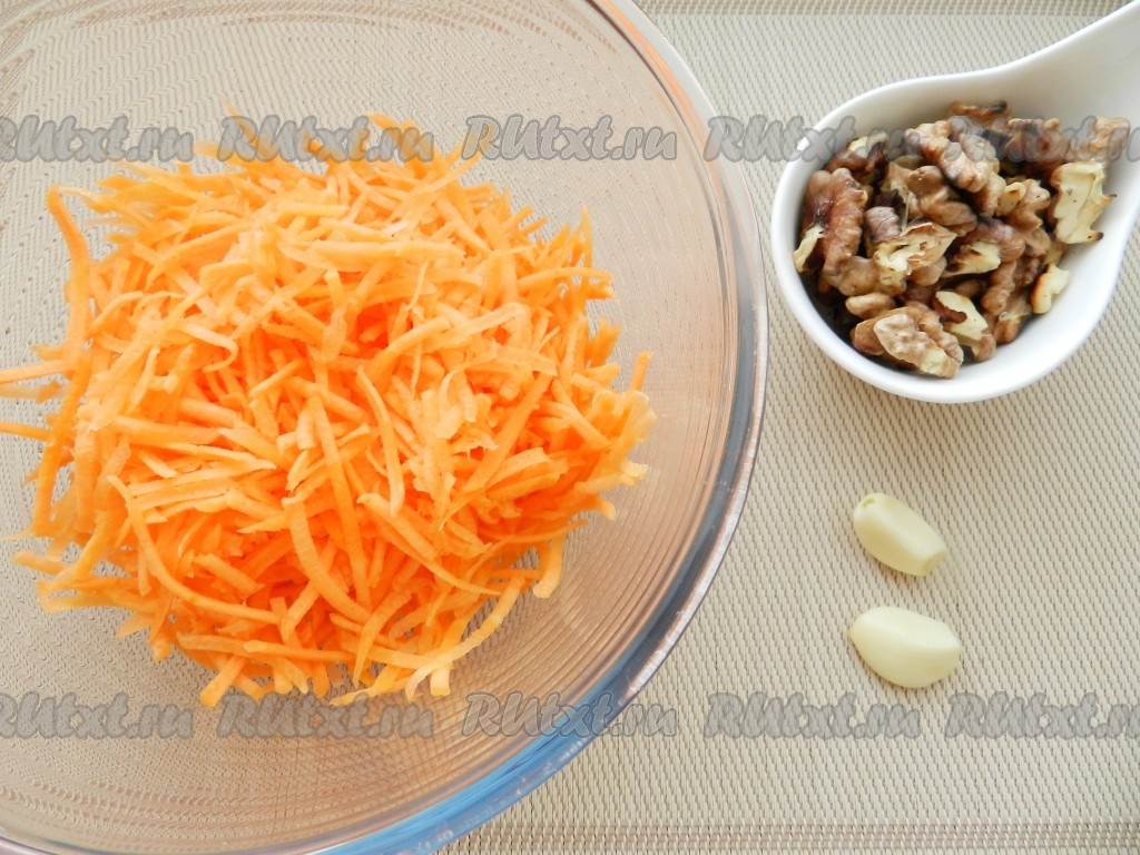Орехи, морковь и чеснок очистить. Морковь натереть на крупной тёрке в глубокую миску.