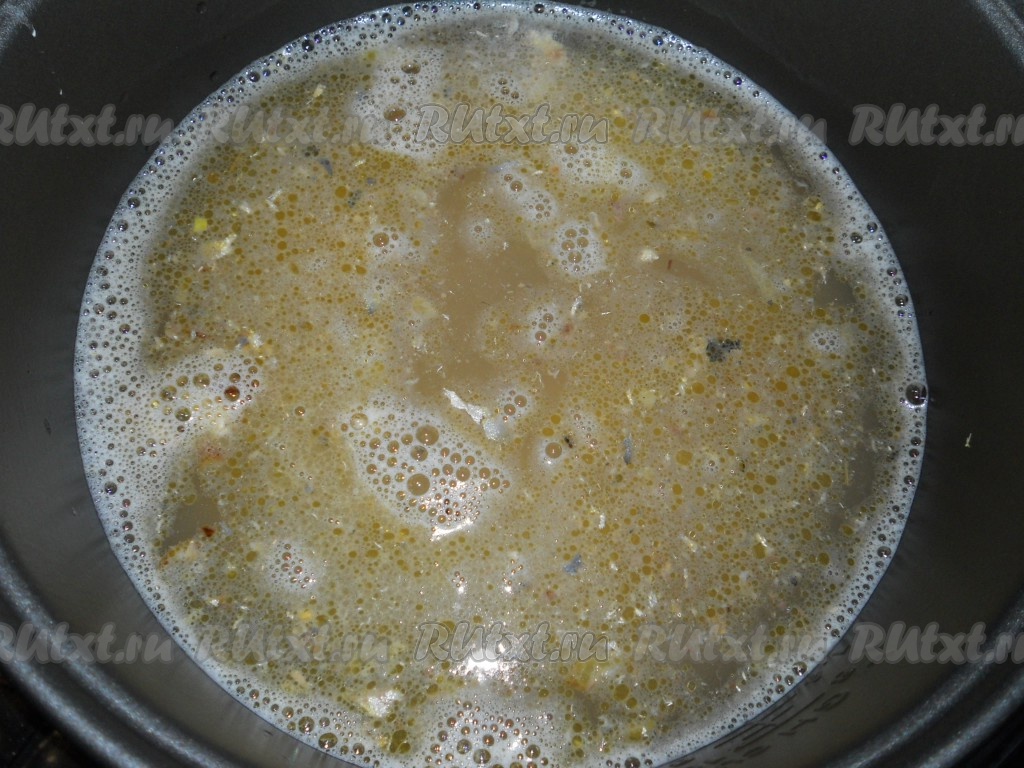 Влить горячую воду, посолить по вкусу. Накрыть крышку мультиварки и выставить режим "Суп" на 1 час.