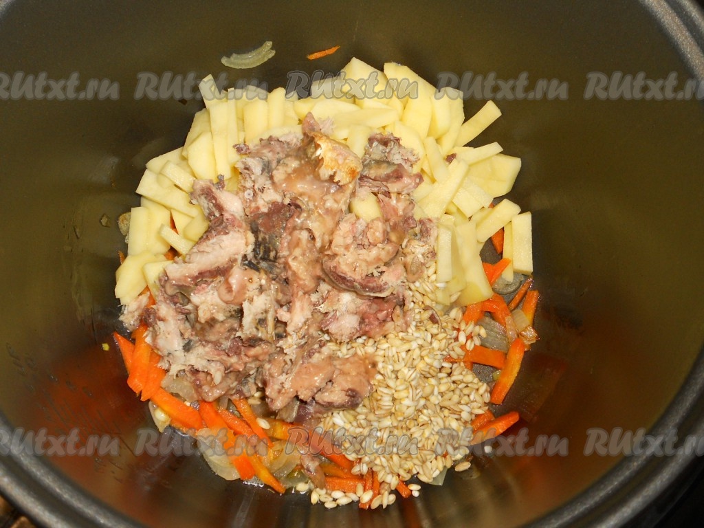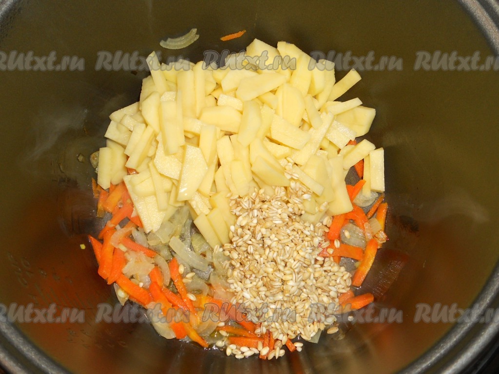 В чашу мультиварки влить растительное масло, выложить лук и морковь, выставить режим "Обжаривание" на 15 минут. После этого добавить в чашу порезанный картофель и промытую перловую крупу.