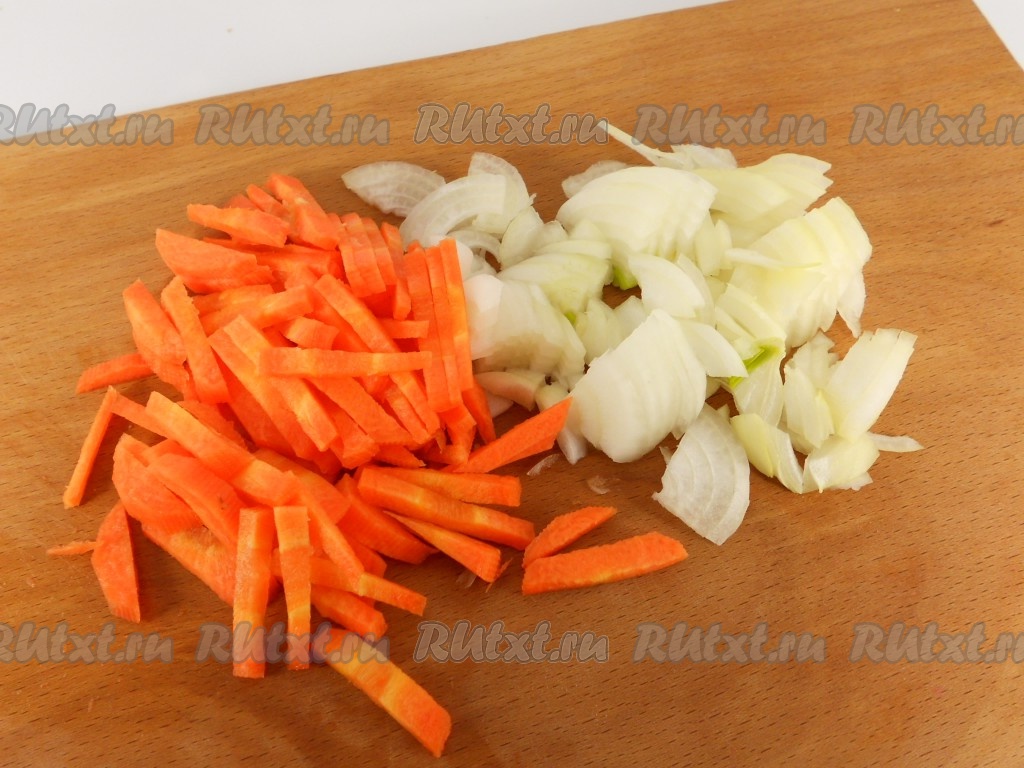 Лук нарезать небольшими кусочками, морковь - брусочками.