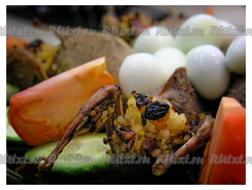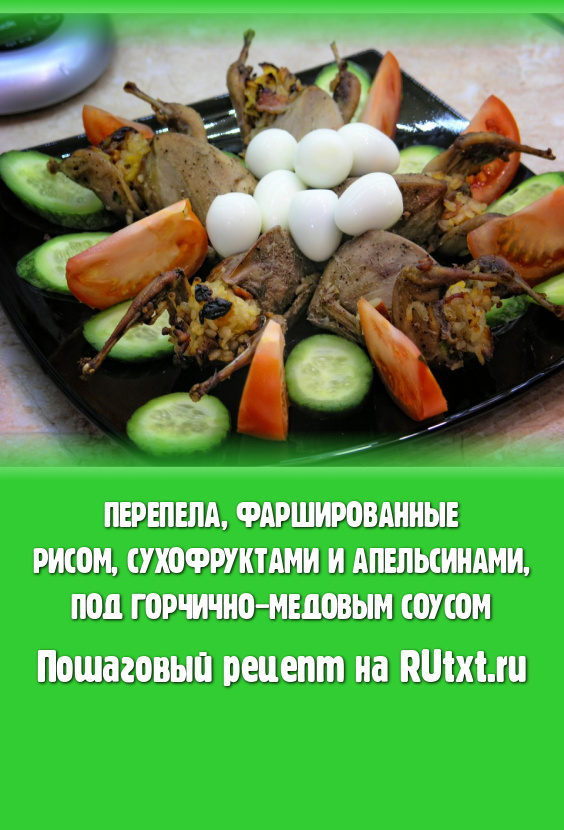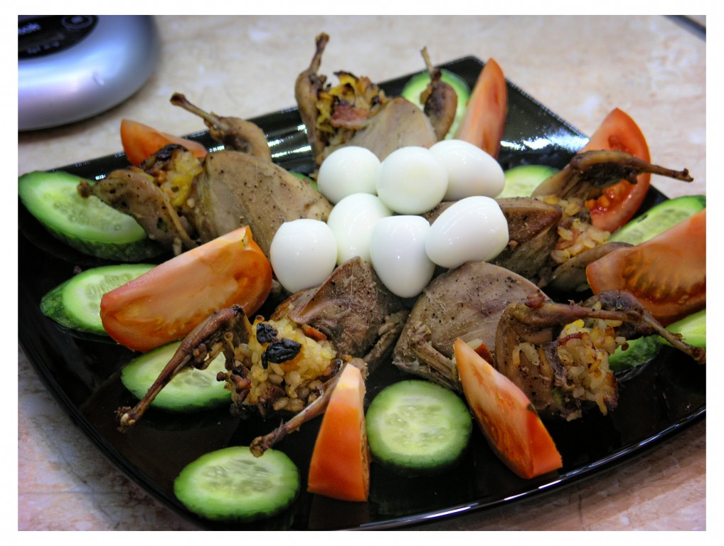Перепелок, фаршированных рисом, сухофруктами и апельсинами, украсить яйцами и овощами.