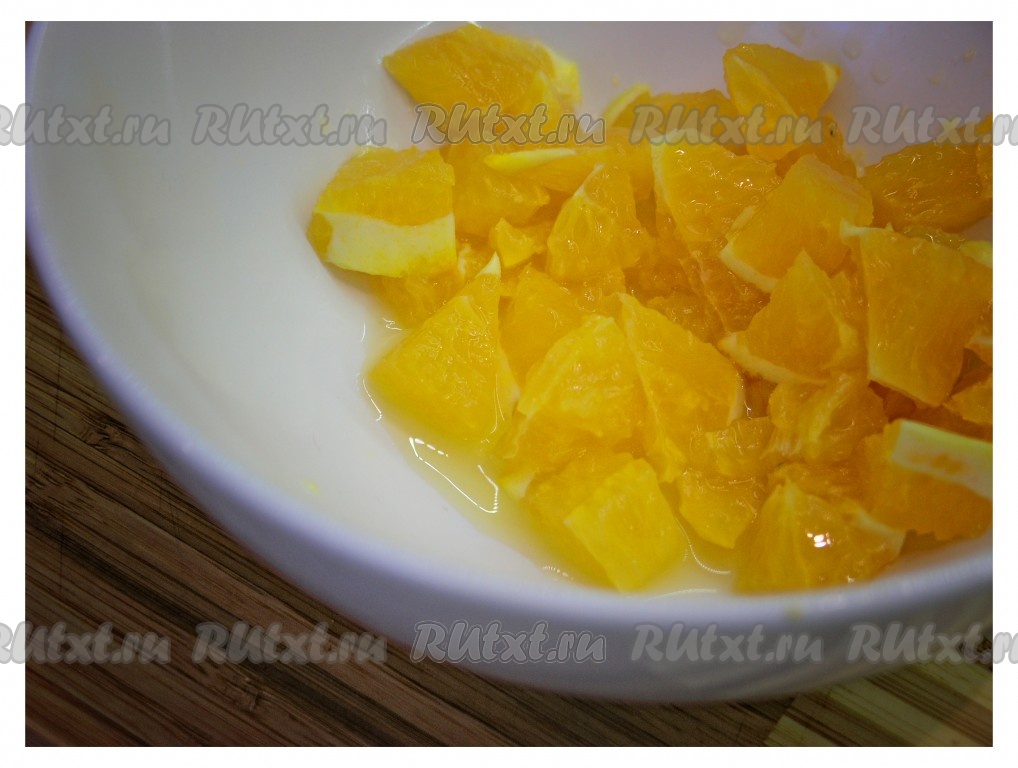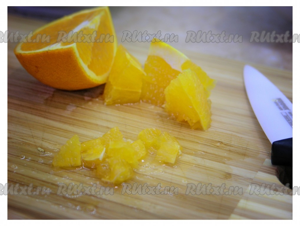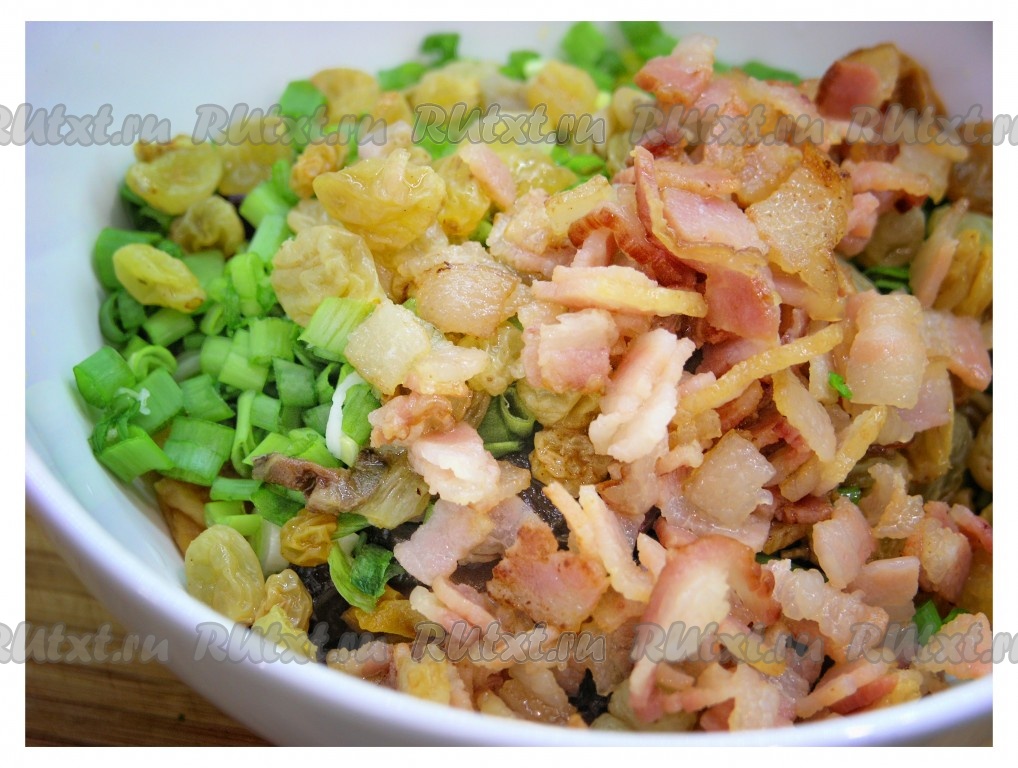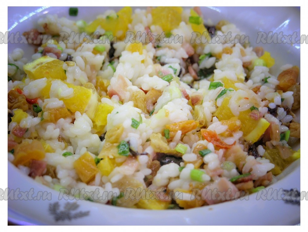 Бекон и рис остудить. И смешать с апельсинами, курагой, изюмом и зеленым луком.