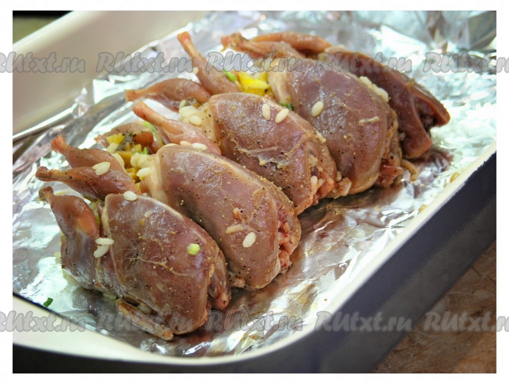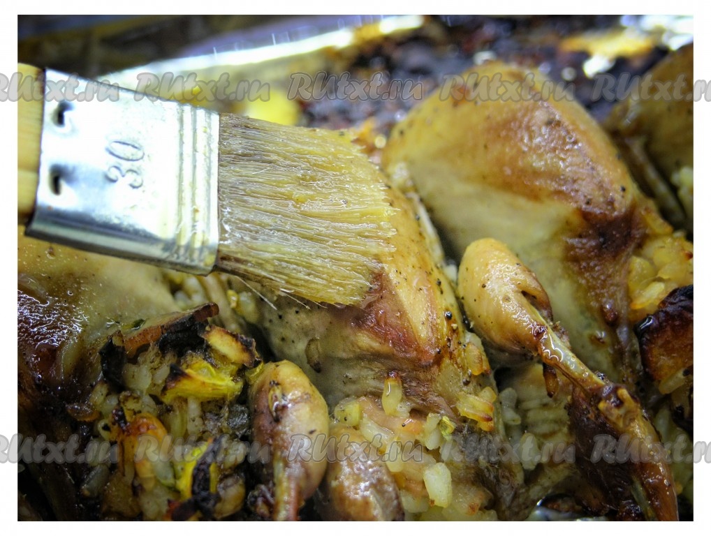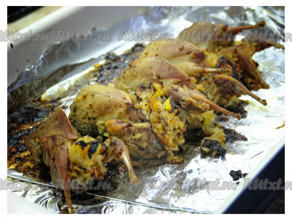 Разогреть духовку до 175 градусов и поставить туда фаршированных перепелок, предварительно смазав их растительным маслом, на 30-35 минут.